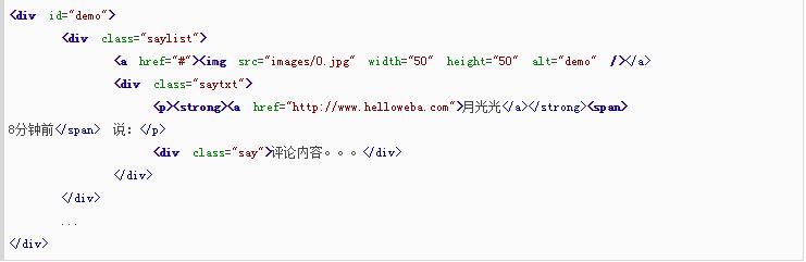 上述HTML結構由N個.saylist構成,用于展示用戶的評論信息,當然在本例中,將由PHP負責生成這段XHTML代碼。