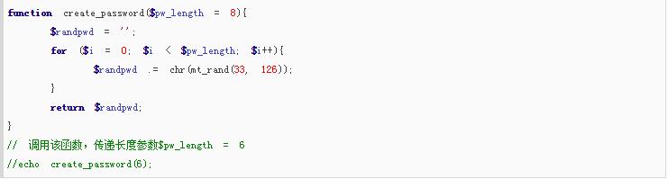 該算法主要用到了兩個(gè)函數(shù),mt_rand ( int $min , int $max )函數(shù)用于生成隨機(jī)整數(shù),其中 $min – $max 為 ASCII 碼的范圍,這里取 33 -126 ,可以根據(jù)需要調(diào)整范圍,如ASCII碼表中 97 – 122 位對(duì)應(yīng) a – z 的英文字母,具體可參考 ASCII碼表; chr ( int $ascii )函數(shù)用于將對(duì)應(yīng)整數(shù) $ascii 轉(zhuǎn)換成對(duì)應(yīng)的字符。