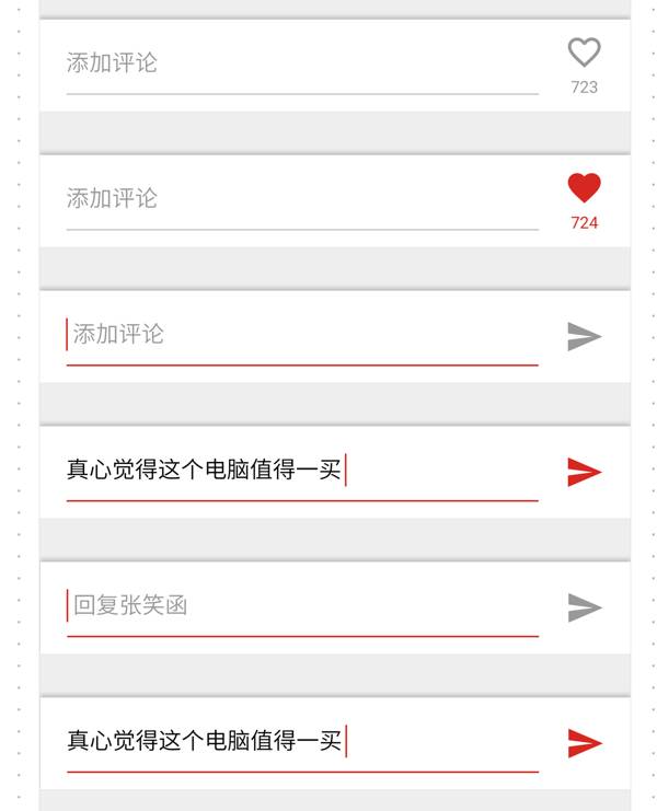 一個評論框,后面的按鈕有點贊或者發(fā)送評論兩種狀態(tài),其中發(fā)送按鈕有根據(jù)輸入框中是否有字分為可點擊和不可點擊兩種狀態(tài)。